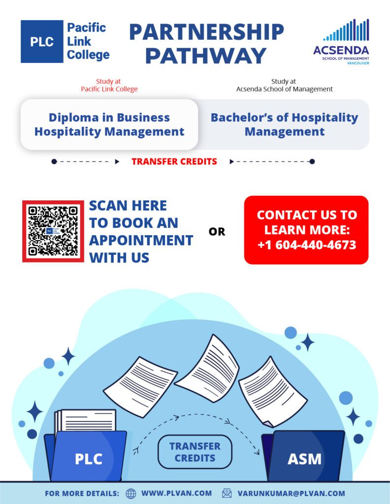 Pacific Link College (PLC) is a proud partner of Vancouver Community College (VCC). Students taking PLC’s Business Hospitality Management Diploma (With Co-op) can transfer credits to VCC’s Hospitality Management Diploma and Bachelor programs.