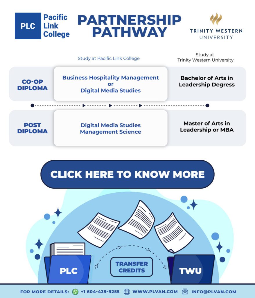 Pacific Link College (PLC) has proudly partnered with the prestigious university Trinity Western University (TWU) – Langley British Columbia to provide a pathway for PLC diploma students to degree program at TWU’s Bachelor and Master programs.